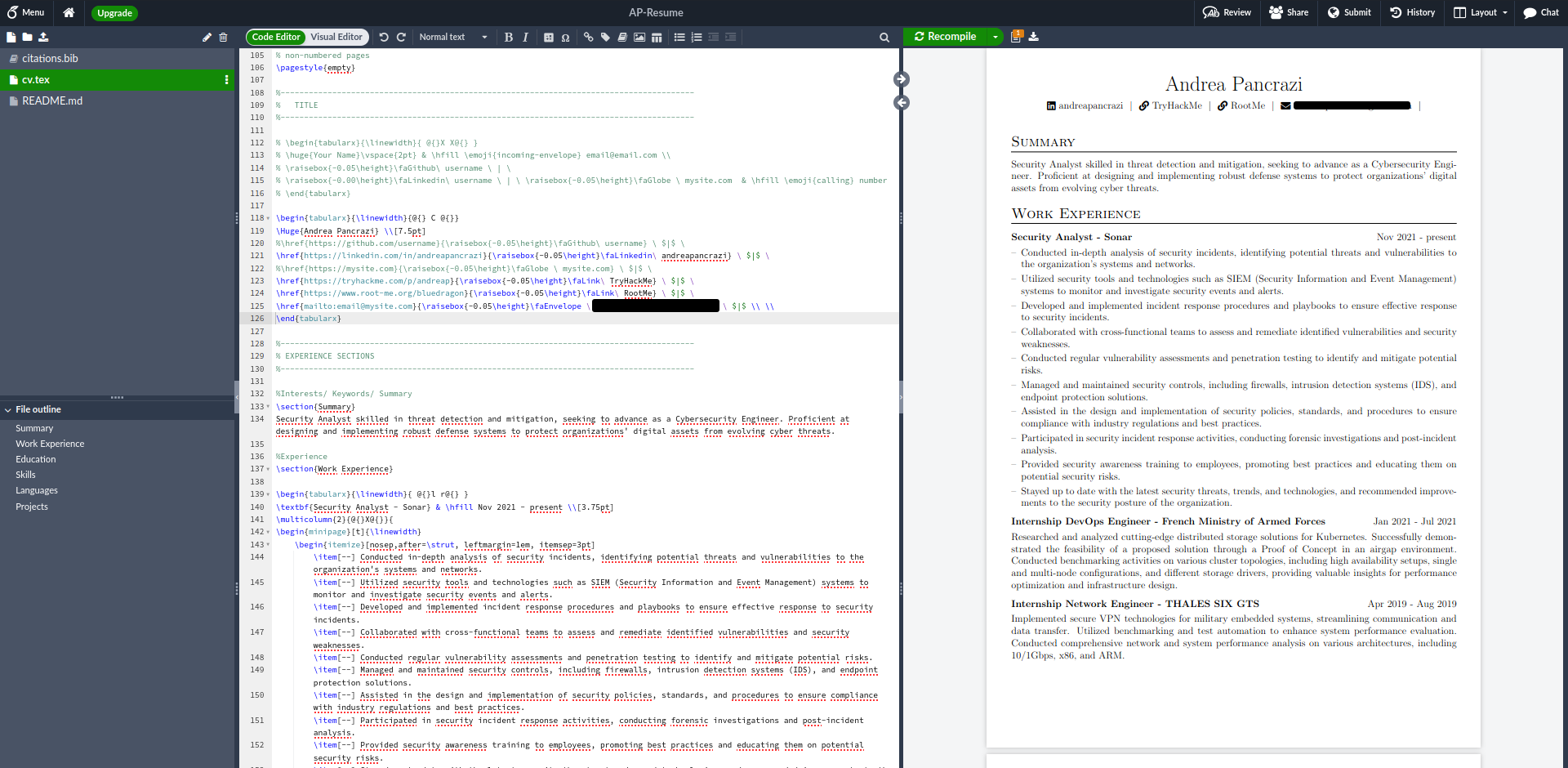 - Focus on the Content - While a visually appealing layout is essential, the content of your resume is what truly matters. Tailor your resume to the specific job you’re applying for, highlighting relevant skills, experiences, and achievements. Draft a brief introduction, no more than three lines for introducing yourself, your job experiences, skills, and education. Consider creating multiple versions of your resume. The only parts that need adjustment are the introduction and the skills section, while the rest like job experiences and education remain constant. For instance, if you’re applying for a pentest job, emphasize your red team skills. For a security engineer role, focus more on blue team skills. And for a threat analyst position, adapt your skills to include expertise in threat intelligence analysis and DFIR. Maintain clarity and brevity in your language. Start by writing down all pertinent information, then refine it through iterative reviews to include only the most essential details.